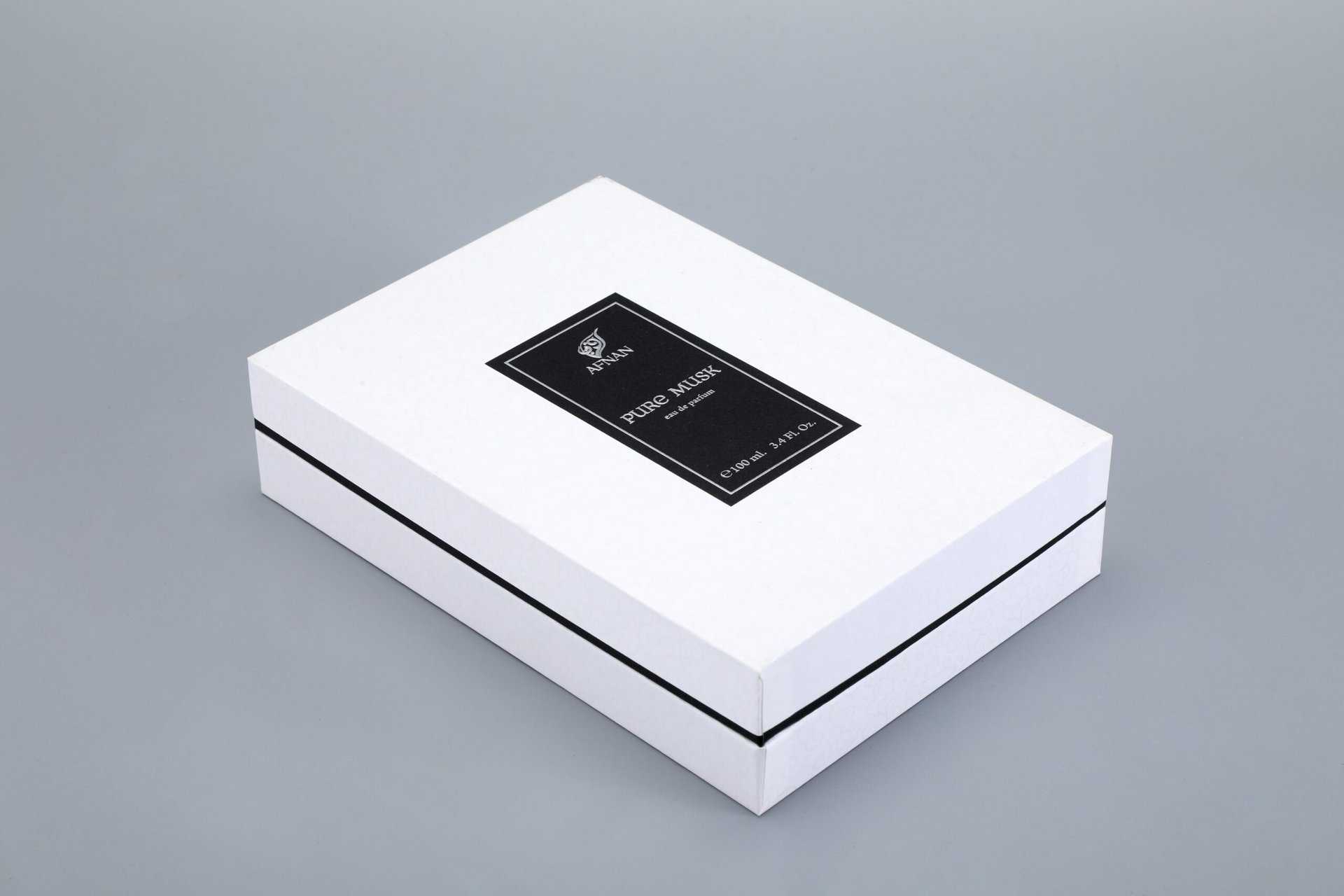 This handmade black-and-white lid and base box is designed for perfume industry packaging. It incorporates foil stamping, enabling customizable branding and design elements.