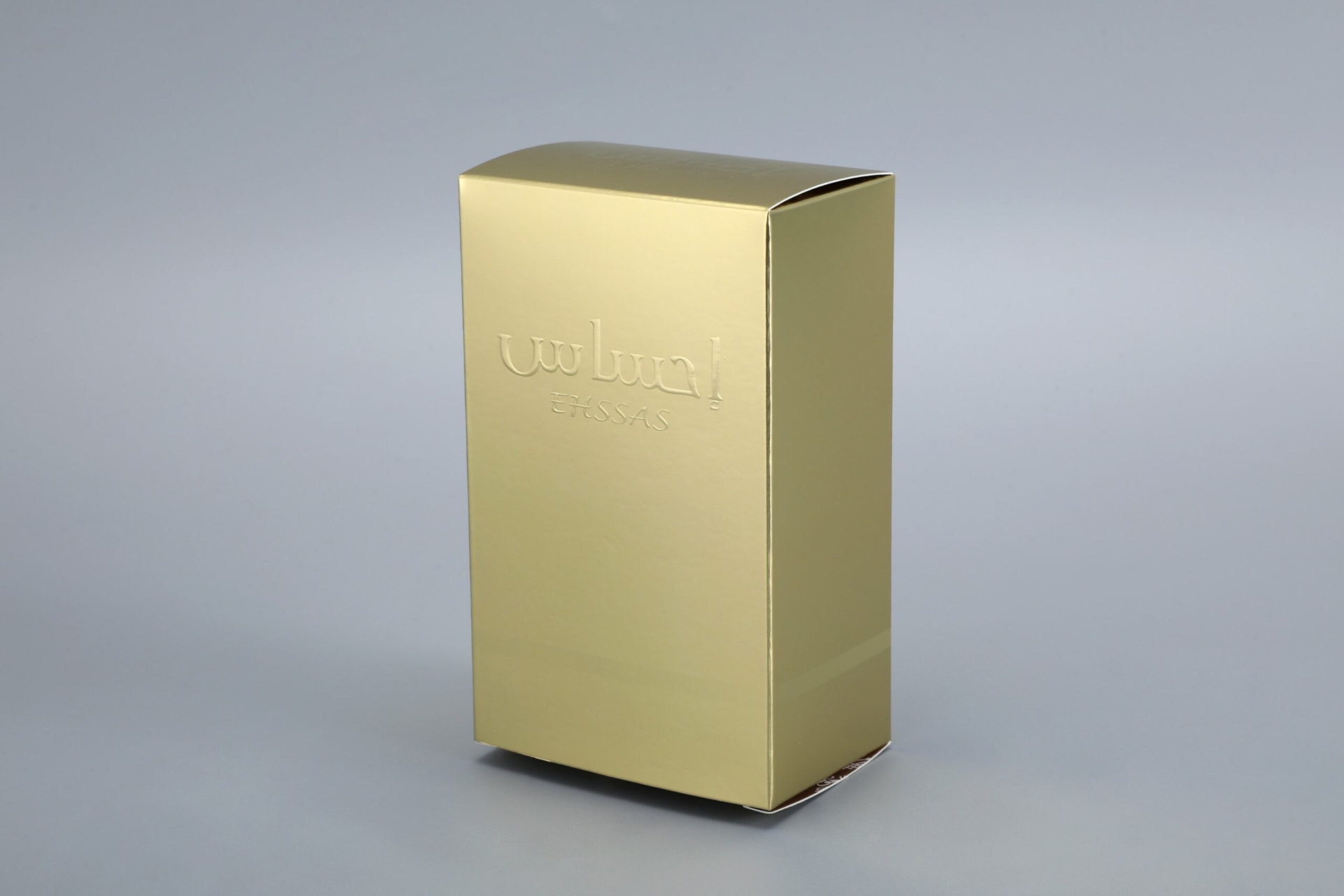 The UV printing perfume box features folding carton construction, embossing, and golden accents, tailored for the luxury fragrance market.