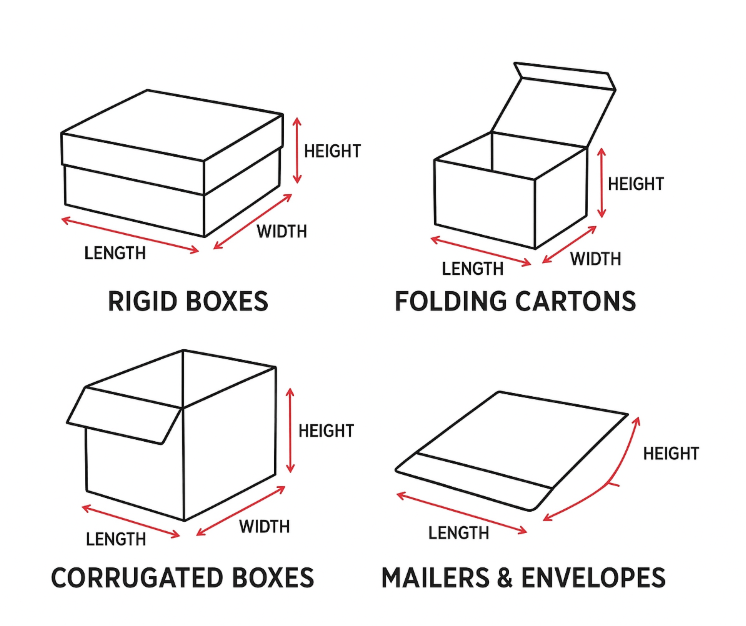 This diagram shows where to measure each type of packaging (rigid boxes, folding cartons, corrugated boxes, and mailers & envelopes)