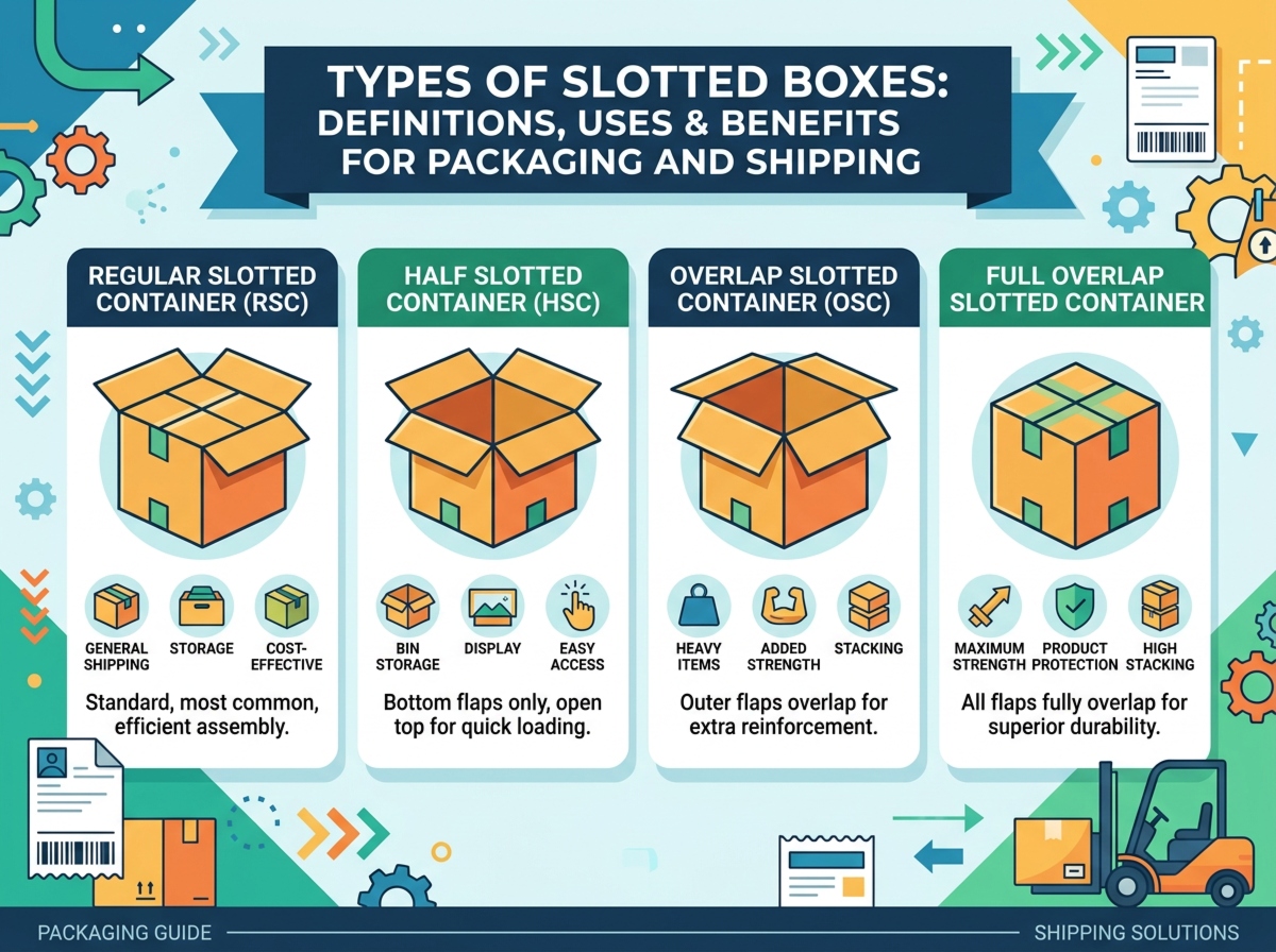 This guide explains each slotted box type with verified ASTM compression data and a clear application-fit matrix, so you can quickly match the right design to your product weight, shipping route, and warehouse demands.
