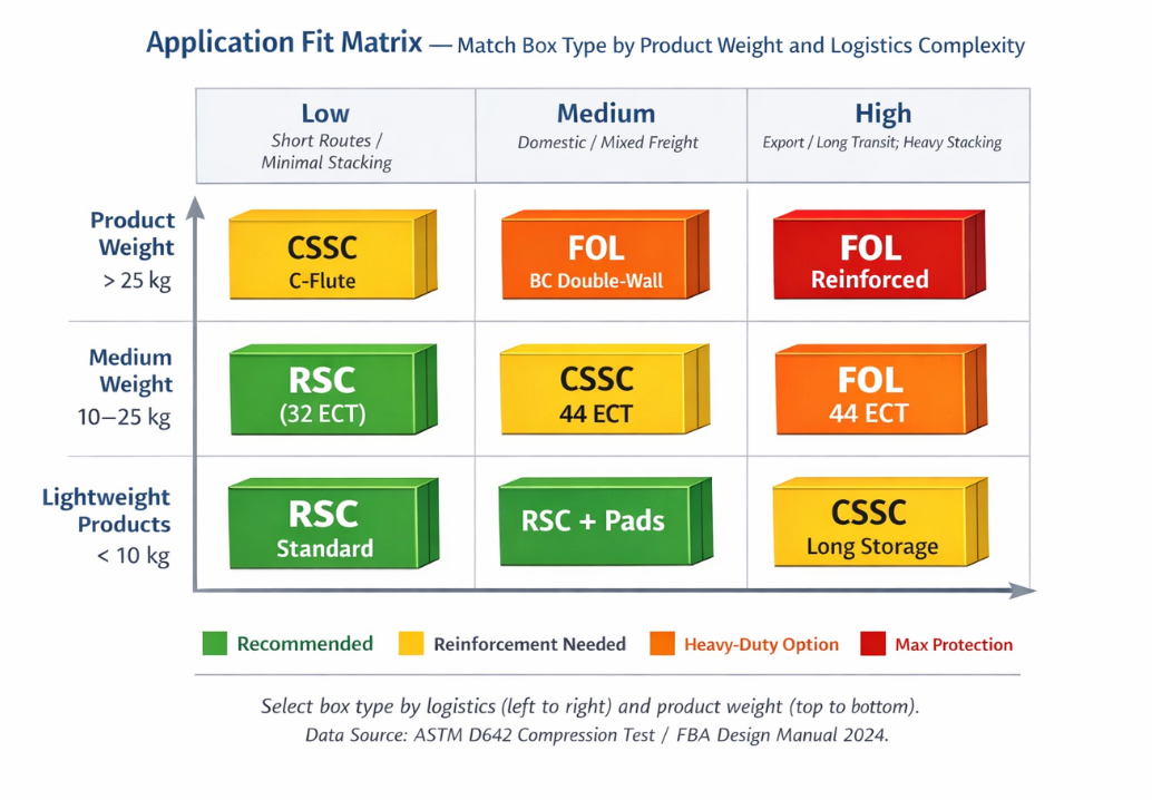 Shipping conditions can tip the scales. Long transit times, warehouse stacking, or mixed freight mean you’ll want stronger corrugated walls and tight flap closure.