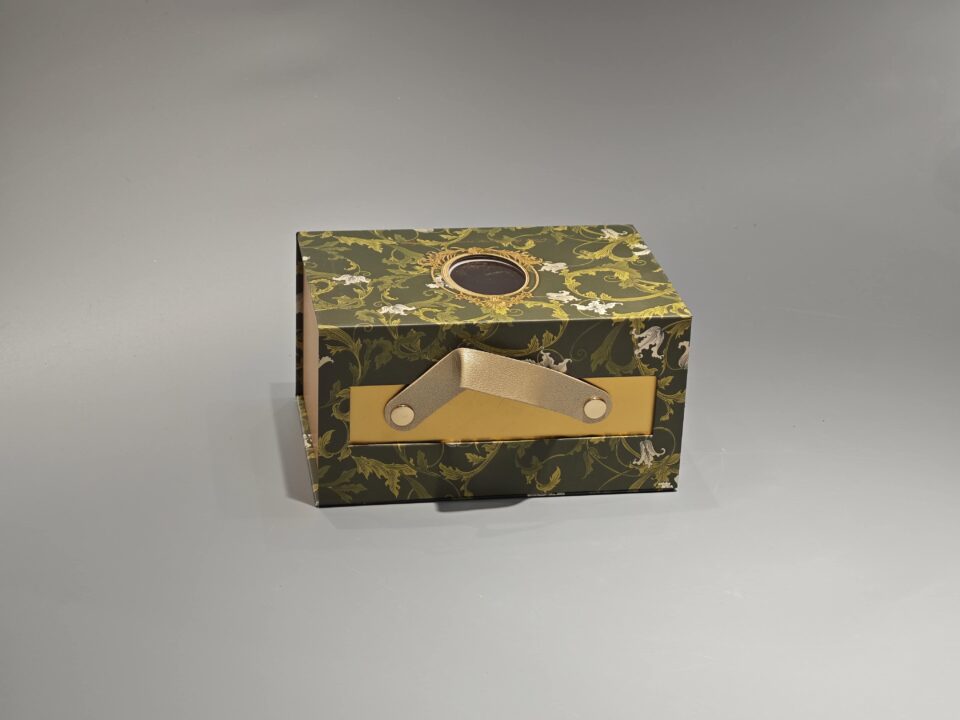 This custom gift box features a magnetic closure and a partial cover with a window, designed for the gift industry. The rigid, one-piece construction in green provides structural integrity, while the window allows visibility of the contents. Its magnetic closure mechanism facilitates easy opening and secure closing, making it suitable for presenting various gift items.