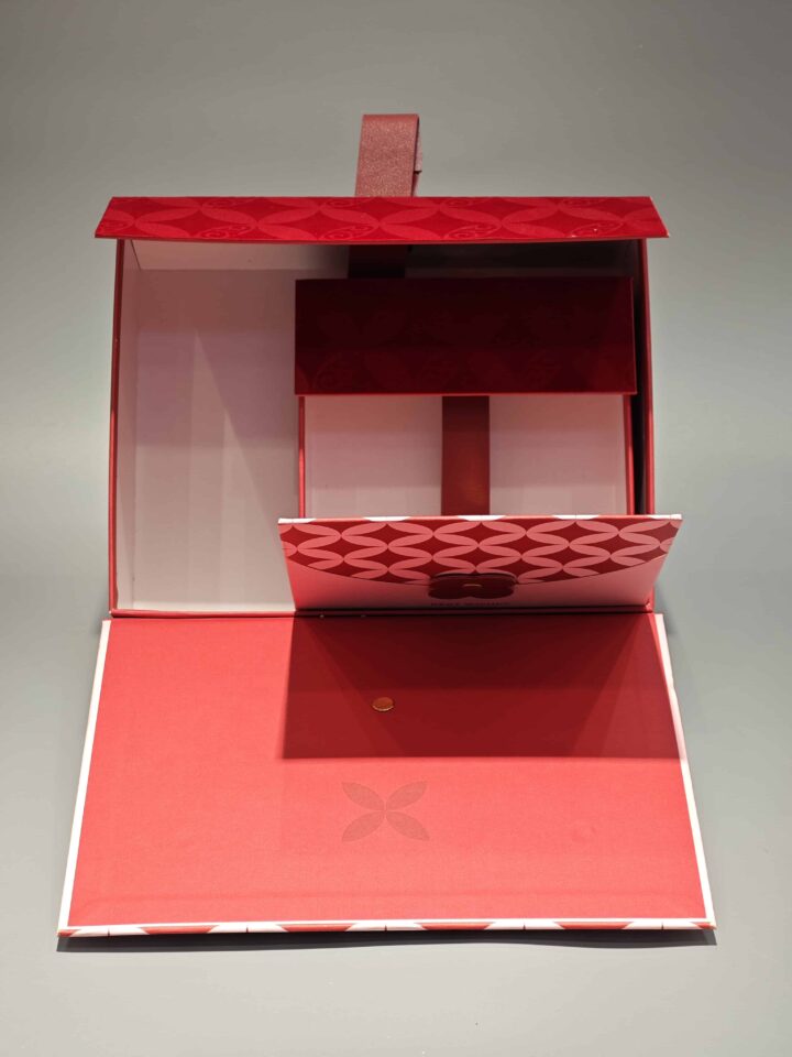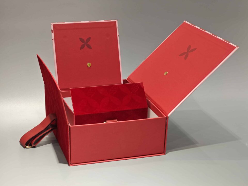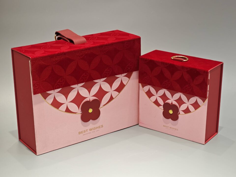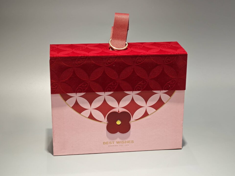 This flip top gift box showcases a custom pattern design and incorporates a magnetic closure, rigid structure, metal buttons, and leather handles. Its red flocking interior and personalized exterior make it suitable for luxury gift packaging in various gift industry applications.