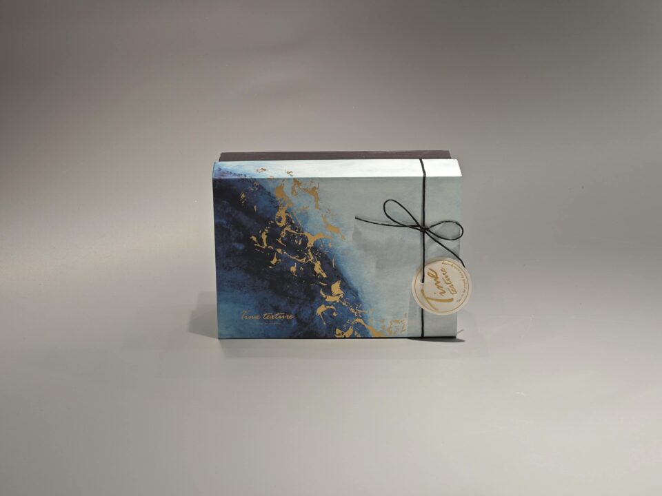 This custom pattern lift-off lid box with ribbon is tailored for the gift industry, featuring a blue and gold abstract print. The two-piece design includes a removable lid for convenient access, complemented by a ribbon that enhances the box’s gift-ready presentation.